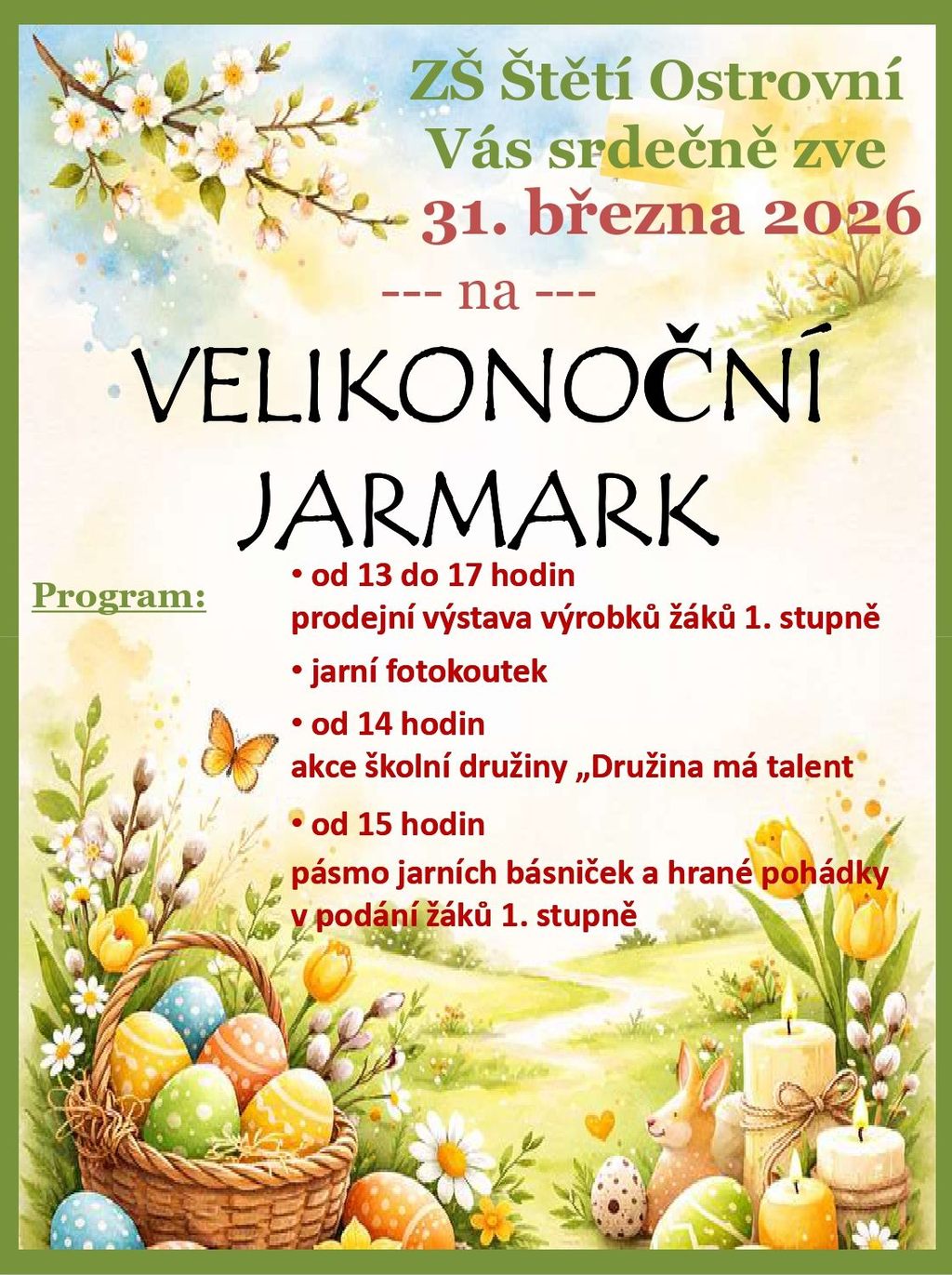 Tento den si rodiče mohli zároveň prohlédnout velikonoční jarmark, kde se děti prezentovaly krásnými výrobky s jarní a velikonoční tematikou. Návštěvníci tak měli možnost nejen podpořit děti, ale také si odnést milé dekorace.